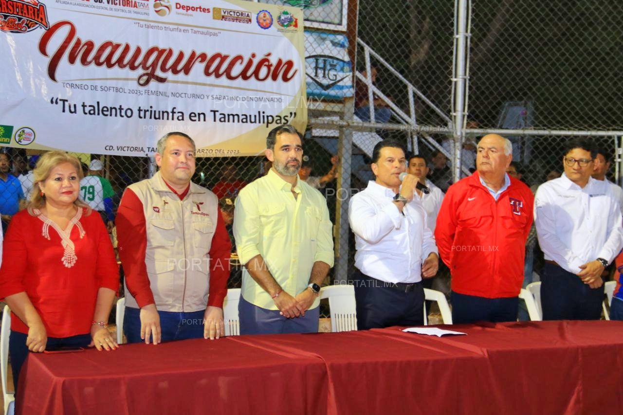 Cd. Victoria, Tamps., 26 de abril. – Apoyar y promover el deporte, es la mejor estrategia para reconstruir la paz y tejido social, aseguró el alcalde Eduardo Gattás Báez, al inaugurar la noche de este martes, junto a Américo Villarreal Santiago, el torneo de softbol 2023 «Tu talento Triunfa en Tamaulipas.